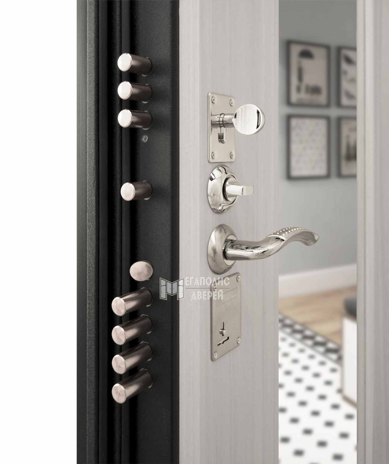 Торец полотна дополнительно оснащён Pin-Up при закрывании противосъёмными штырями, благодаря чему модель «Т3М» невозможно будет не только взломать, но и снять с петель.